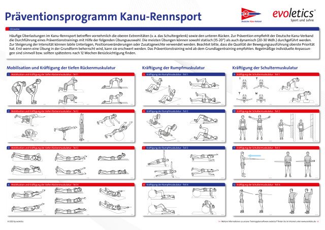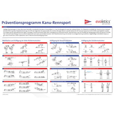 Das großformatigen DKV-Leitbild-Poster zeigt anschaulich und detailreich die Basics der grundlegenden Bewegungsabläufe. So sind sie hilfreich beim Trainingseinstieg und unterstützen die Übenden bei der Selbstkontrolle.Die Grafiken entsprechen der DKV-Rahmenkonzeption Kanu-Rennsport und wurden von der Firma Evoletics zusammen mit den Bundestrainerinnen Juliane Marek und Tina Kövari exklusiv für den DKV entwickelt.