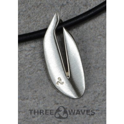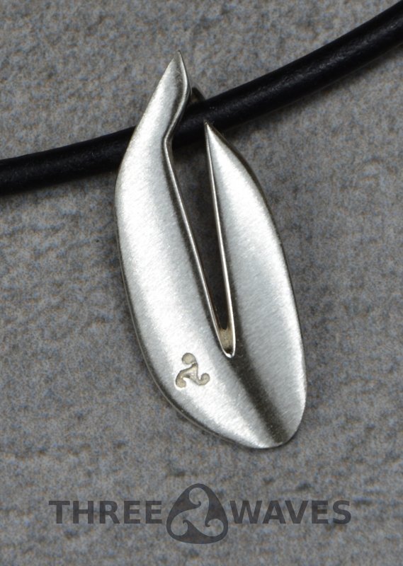 Das schlichte Oberflächen-Design, lässt die Paddelform dieses Anhängers sehr gut zur Geltung kommen. Die einzige Stuktur auf der Paddeloberfläche ist das geprägte threeWaves-Logo. Durch den zentral verlaufenden V-Schnitt wird der Anhänger optisch aufgelockert. Rückseitig ist eine Durchführungsöse für die Aufnahme von Lederbändern, Ketten, etc.