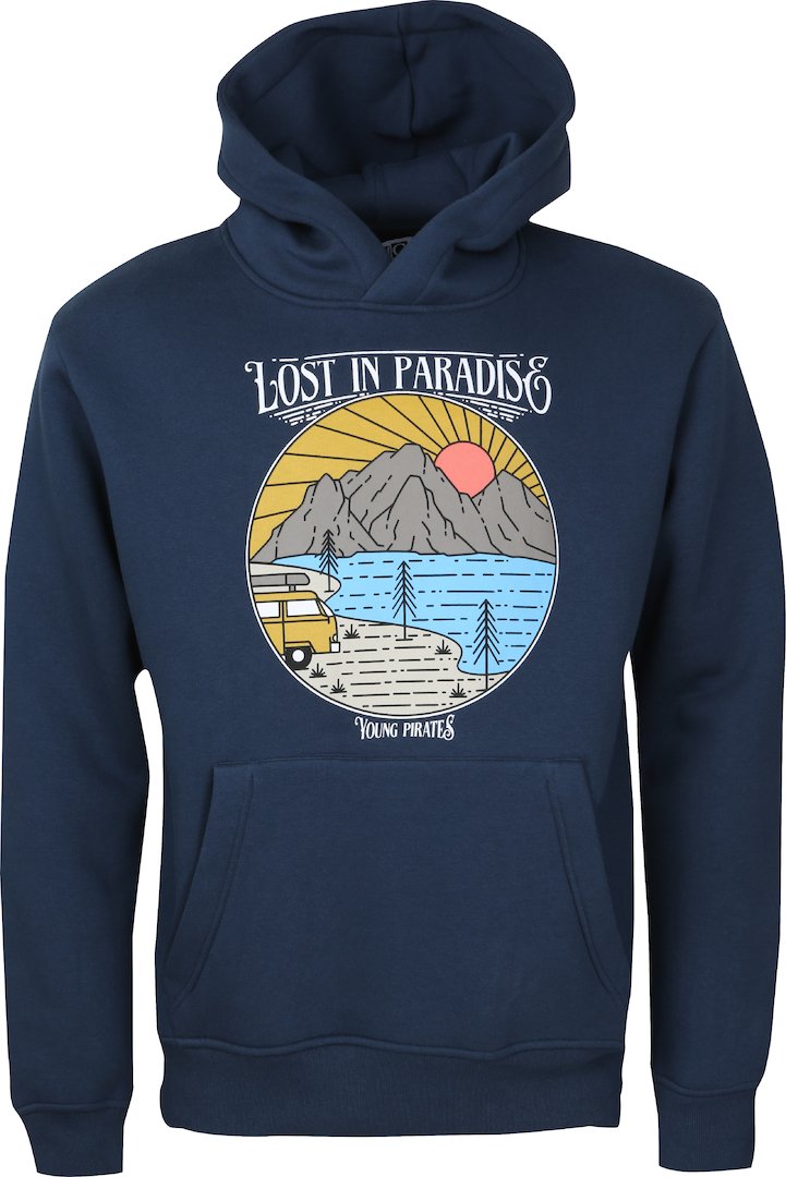 Der YOUNG PIRATES PARADISE HOODY ist ein lässiger Kapuzenpullover mit Lifestyle Motiv. Der Hoody hat eine kordellose Kapuze und einen Bulli, Berge, See Aufdruck in Biofarbe. Versteckte Reißverschlüsse im Kängurubeutel bieten mit verschließbarer Pouchpocket Schutz vor Diebstahl. Die Mischung aus Bio-Baumwolle und recyceltem Polyester macht den Hoody von YOUNG PIRATES weich und bequem.