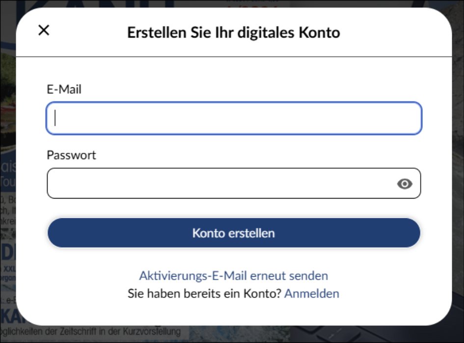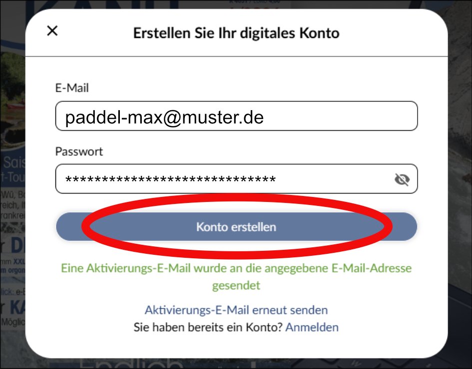 | Schritt 5 Fast fertig. Nachdem Sie Ihre E-Mail Adresse eingegeben haben und ein neues Passwort vergeben haben klicken Sie nun auf den Schalter "Konto erstellen". Ihnen wird nun an Ihre E-Mail Adresse eine Aktivierungs-E-Mail verschickt. Bitte klicken Sie in dieser Aktivierungs-E-Mail auf den Bestätigungslink. Geschafft. Sie haben nun Ihr Konto für den Zugriff auf die digitale Ausgabe des KANU-SPORT erfolgreich aktiviert.